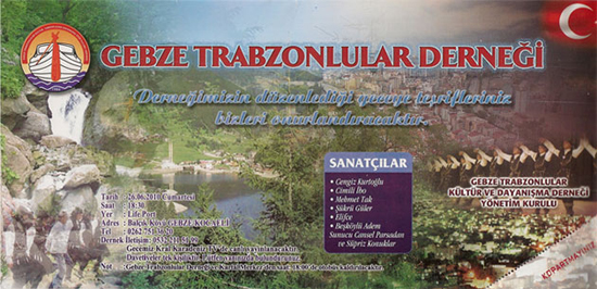 Sitemiz yöneticilerinden Akif BAL' ın da üyesi olduğu Gebze Trabzonlular Derneği her yıl geleneksel olarak düzenlediği yaz eğlencesini bu sene 26 Haziran 2010 tarihinde gerçekleştirecek. Bu muhteşem gece 26 Haziran Cumartesi günü Gebze Şekerpınar Life Port Sosyal Tesisleri ve Spor Kompleksinde düzenlenecek. Her yıl Kocaeli ve İstanbul’da yaşayan Trabzonlular tarafından dört gözle beklenen gece ise bu yıl birbirinden süpriz gelişmelere sahne olacak.